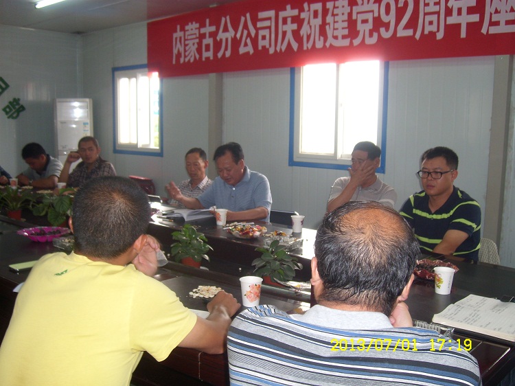 ——内蒙古分公司庆祝党成立92周年主题座谈会 近日,内蒙古分公司组织了题为“庆祝建党92周年,共话中国梦”的主题活动,活动由内蒙古分公司党总支书记主持,全体党员和积极分子参加,在鄂尔多斯广场项目部举行。 举...