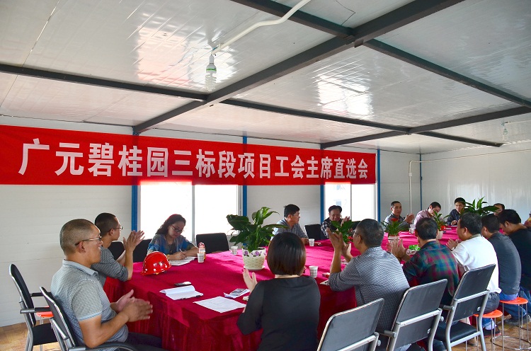 内蒙古分公司广元碧桂园三标段项目部于9月29日下午,举行了工会主席的直接选举会,公司工会主席郭俊清一行到会指导工作,推进基层民主建设。 遵照《工会法》规定,在广泛听取项目职工意见的基础上,报经党总支同意,...