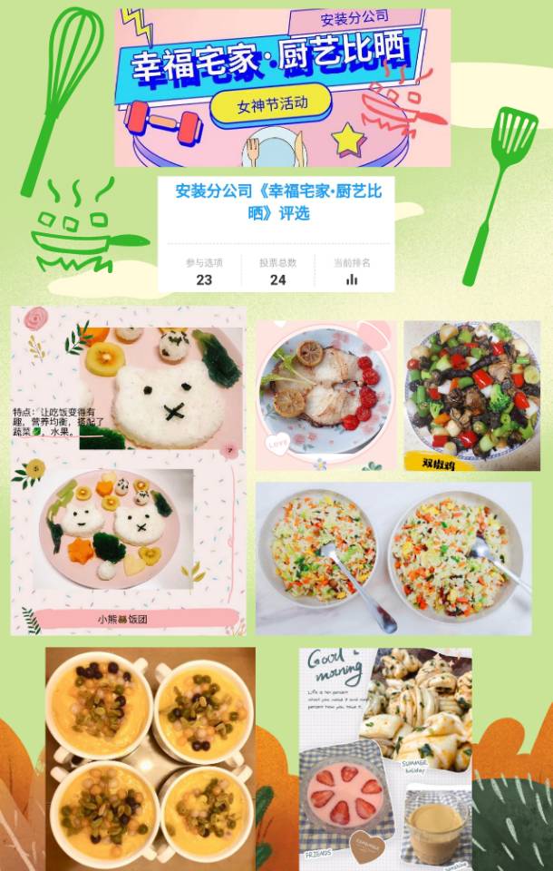 抗疫当前,别样“三八”。根据公司工会“抗击疫情·‘艺’起行动”三八妇女节主题活动安排,3月14日,安装分公司举办了“幸福宅家·厨艺比晒”网络厨艺活动,全体女职工紧紧围绕“秀厨艺,晒厨房,抗击疫情我健康”的活...