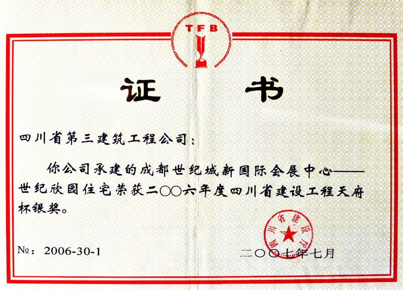 商鼎国际2号楼工程荣获2008年度四川省建...