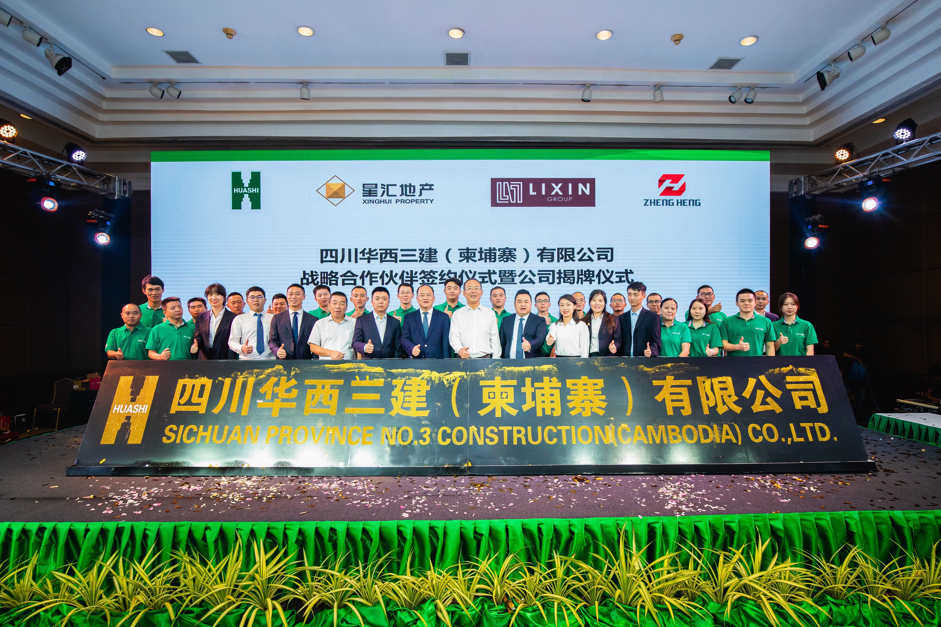 10月24日上午,四川华西三建(柬埔寨)有限公司与星汇房地产发展(柬埔寨)有限公司、利鑫土地有限公司、正恒(柬埔寨)有限公司战略合作协议签约仪式暨柬埔寨公司揭牌仪式在金边隆重举行。集团公司总经理杨斌,集团公司市场经营部部长陈颖锐,外经管理部部长兰北,总经办主任杨海军,中华西董事长史立宾,六公司董事长任予锋,十二公司党委书记朱军,公司董事长范晓晋,星汇地产董事长彭夷星,利鑫集团执行长许铭钊、总经理王宗隆,正恒集团董事长邓丕兵亲临签约现场,共同出席并见证签约暨柬埔寨公司揭牌仪式。