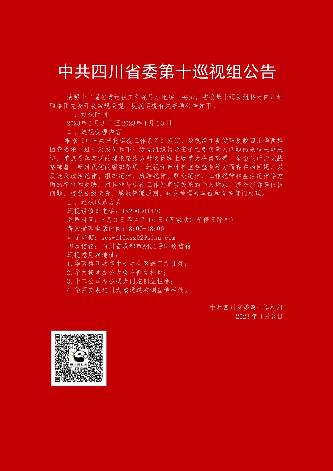 根据省委关于巡视工作的统一部署,2023年3月3日,四川省委第十巡视组巡视四川华西集团有限公司党委工作动员会召开。会前,巡视组召开了与华西集团主要领导的见面沟通会。动员会上,省纪委副书记、省监委副主任、省委巡视工作领导小组成员赵正文对做好巡视工作提出明确要求,省委第十巡视组组长赵晓东作巡视动员讲话,华西集团党委书记、董事长杨斌主持会议并代表集团党委作表态发言。