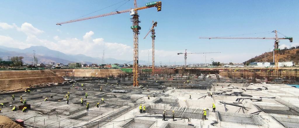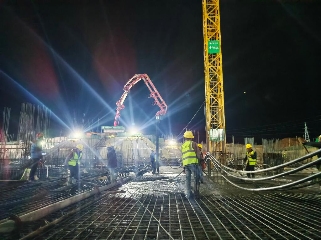 该项目施工任务繁重,自2022年12月进场开始,施工现场就进入每日“白+黑”施工模式。从刚进场,就同建设单位协调搬迁和高压线移线等难题,短短三个多月就完成了现场打围、临舍搭建、土方开挖,并于3月21日完成第一次筏板砼浇筑。