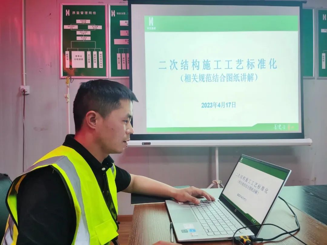 在该项学习活动中,项目老中青管理人员齐上阵,各取所长,拿出真本领,采取个人自学、前辈授课、集中交流的方式展开,共同“充电”学习。截至目前,“华西青年课堂”已开展5堂授课,包括施工临电、安全文明施工、现场管理及规划、二次结构砌体及钢筋工程等学习内容。每位讲师充分发挥自己所擅长的领域,利用下班时间认真准备了PPT,给大家带来了一堂堂全面详细的“知识大餐”。讲解结束后,全体管理人员集中交流讨论,展开一场场专业知识的“头脑风暴”。