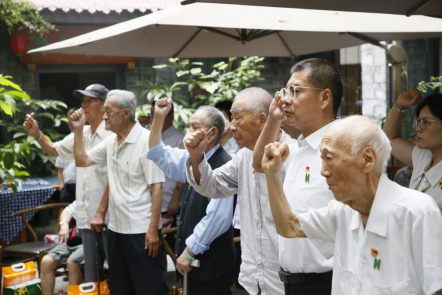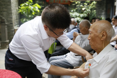 活动在《逐梦前行》背景音乐中拉开序幕,梁涛为离退休老党员、老干部授戴中国共产党党徽和集团司徽,并送上了公司党委精心准备的七一慰问品。