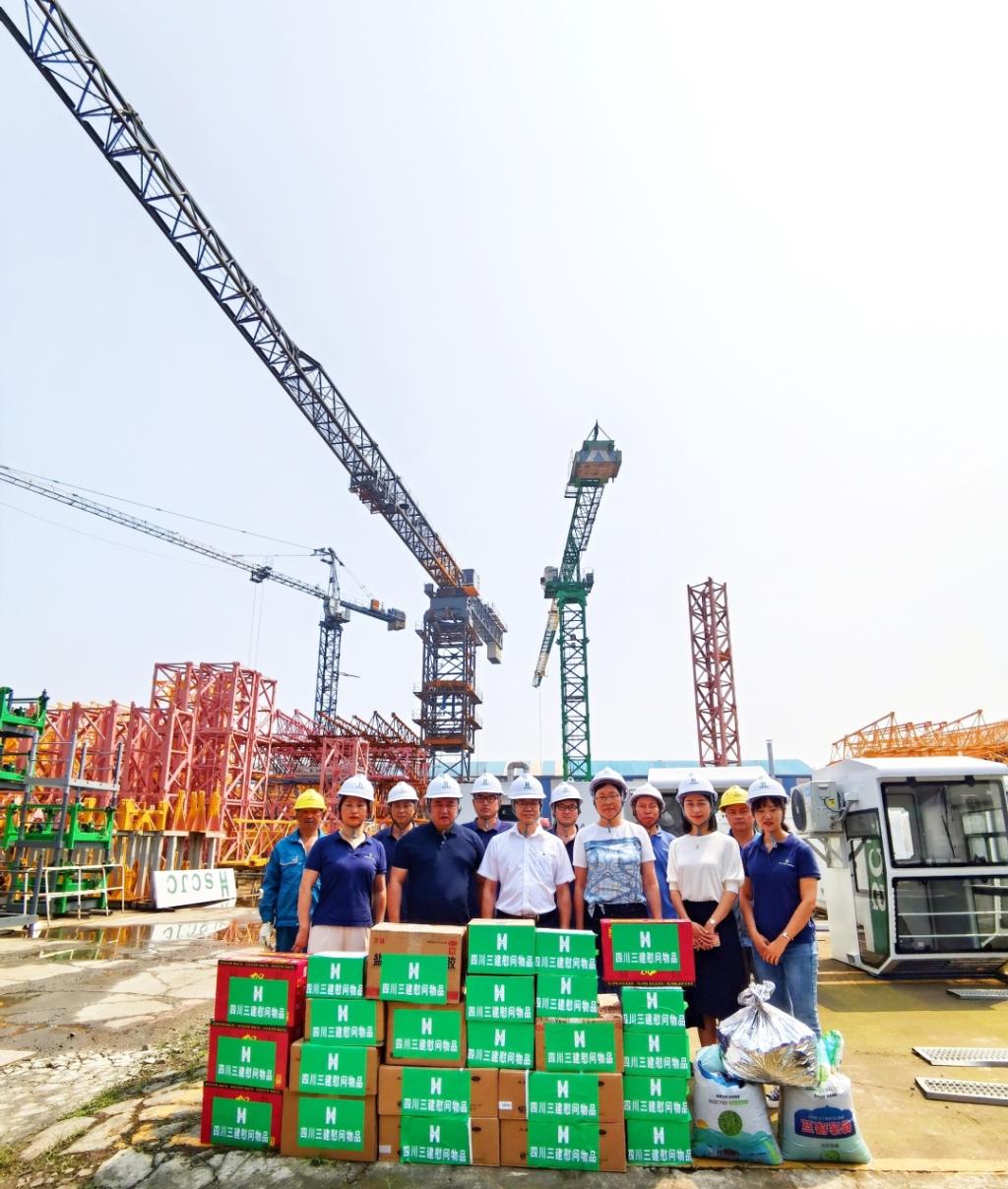 图为梁涛一行到锦城公司送清凉,左上角为锦城公司JP1000新型塔机