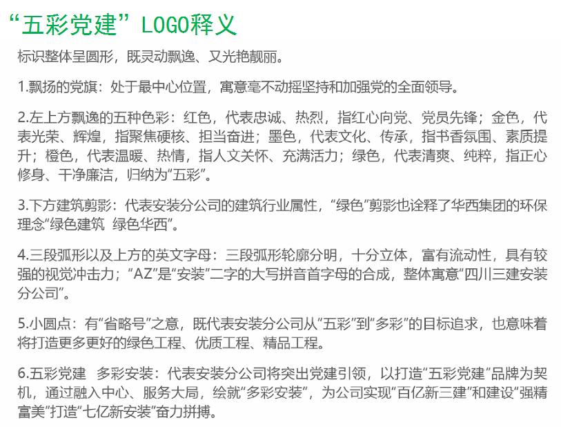 踏上新征程,扬帆再起航 。经过深入总结提炼,安装分公司形成了“五彩党建”品牌。“五彩”是以五种颜色为基础,涵盖了“深化红色教育、筑牢金色堡垒、打造墨色文化、增强橙色关爱、营造绿色清风”等五种举措,旨在努力打造“学习型、战斗型、文化型、服务型、清风型”党组织,最终实现“擦亮党建品牌、焕发组织活力”和“打造‘五彩’党建’,绘就多彩安装”的奋斗目标。发布会为“五彩党建”品牌揭幕,随着红色帷幕缓缓揭开,“五彩党建”品牌LOGO精彩呈现。会议还对“五彩党建”品牌LOGO进行了详细解读。