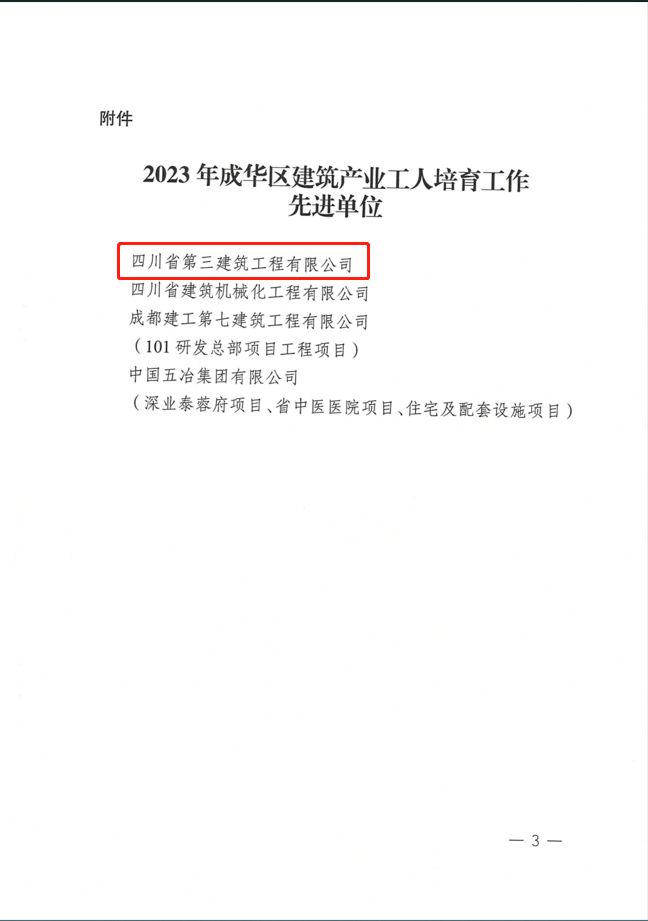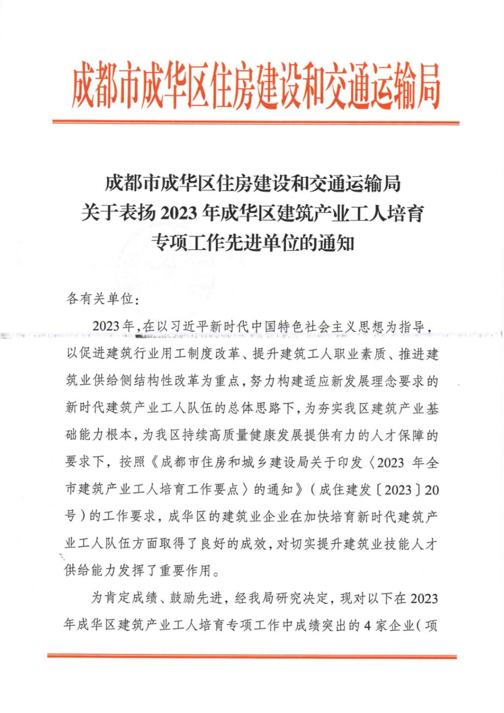 8月29日,成都市成华区住房建设和交通运输局发布“关于表扬2023年成华区建筑产业工人培育专项工作先进单位的通知”,公司获评为“2023年成华区建筑产业工人培育专项工作先进单位”。本奖项是在全区建筑业单位内进行的评选表彰活动,是对建筑产业工人培育工作的重要表彰,此次表彰充分肯定了公司在建筑产业工人培育专项工作成果。