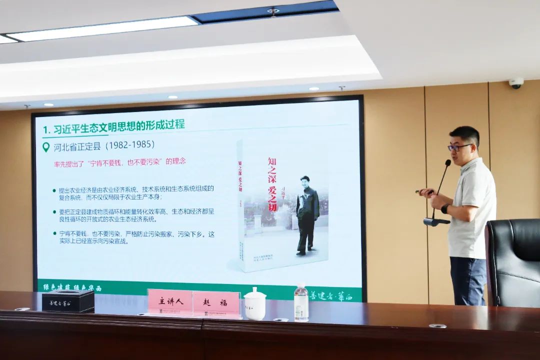 集团运营管理中心赵福从“习近平生态文明思想”的形成过程入手,对生态文明建设及工作要求进行了宣讲。