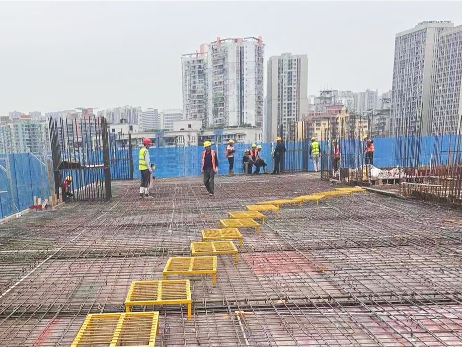 项目工期紧节奏快,为顺利完成施工任务,从绑钢筋、支模板到浇筑混凝土必须保证穿插有序。时逢雨季,连绵不断的阴雨天气使得G地块1号楼的屋面钢筋施工进度延后,为保证各项工序进度,大北区项目6个参赛钢筋班组优化施工计划,多措并举努力克服雨季施工困难,在保证安全、质量的前提下,小雨快干,雨停大干,在计划时间内顺利完成钢筋绑扎工作。