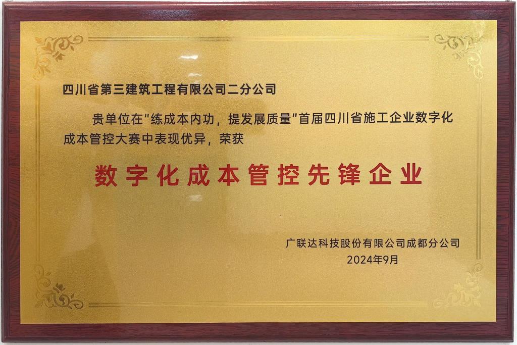 近日,第二分公司在四川省施工企业数字化成本管控大赛中获得“数字化成本管控先锋企业”。