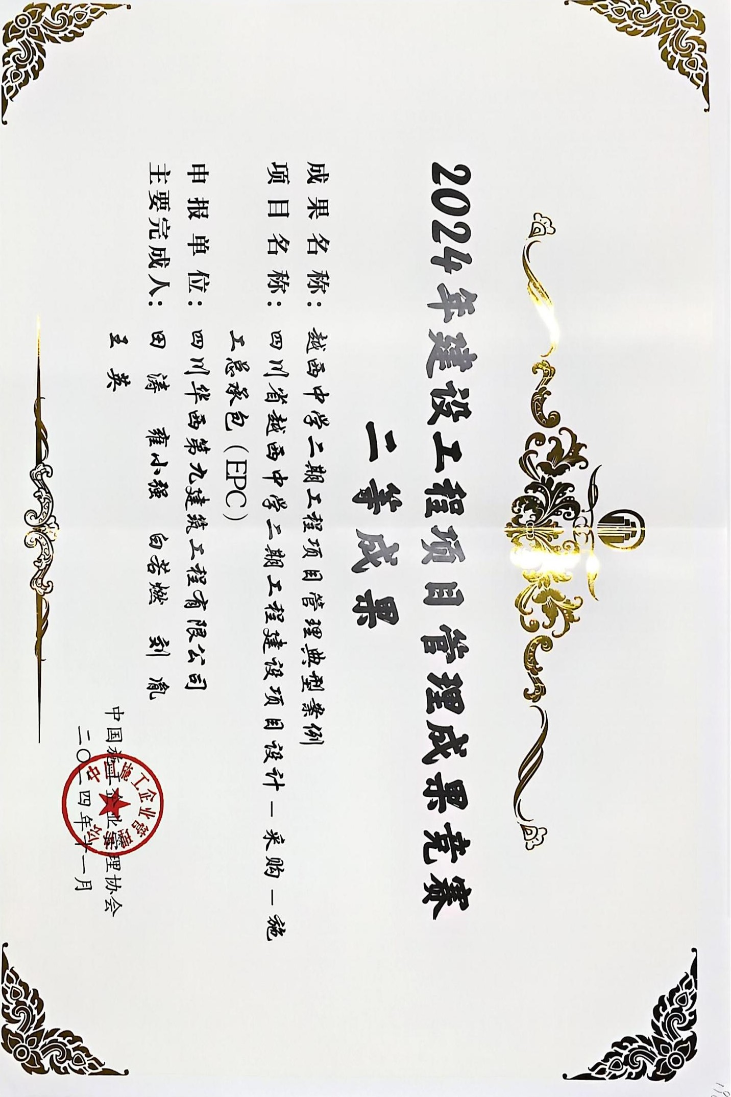 该竞赛旨在总结推广建设工程项目管理先进经验,引领企业不断推进工程项目管理创新,提升企业核心竞争力。此次九工程公司申报获奖项目为越西中学二期工程建设项目设计—采购—施工总承包(EPC),该项目此前曾荣获凉山州建设工程“邛都杯”奖(州优质工程)、四川省建设工程“天府杯”奖(省优质工程)。