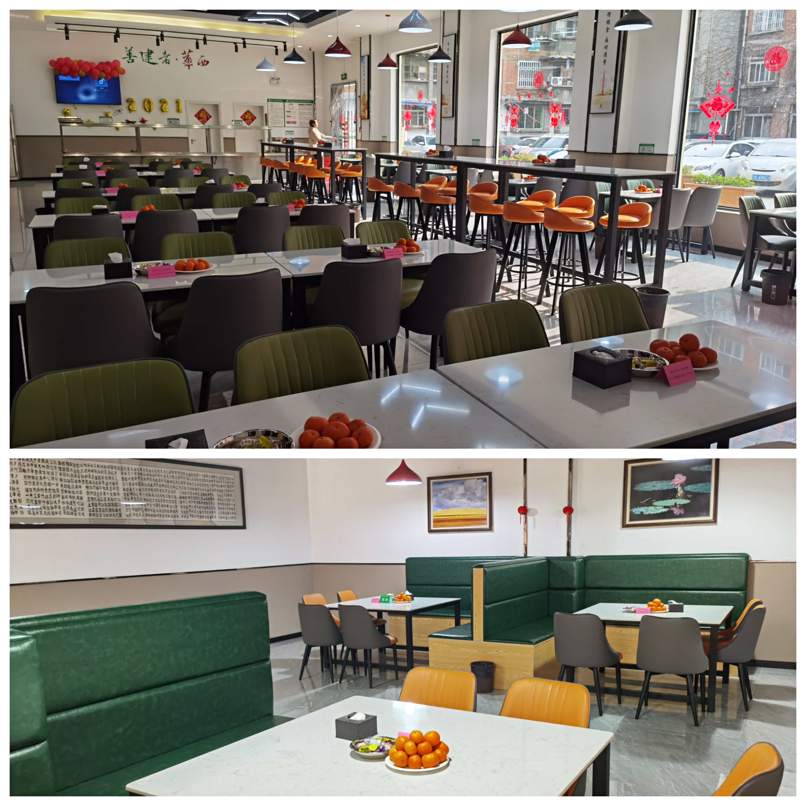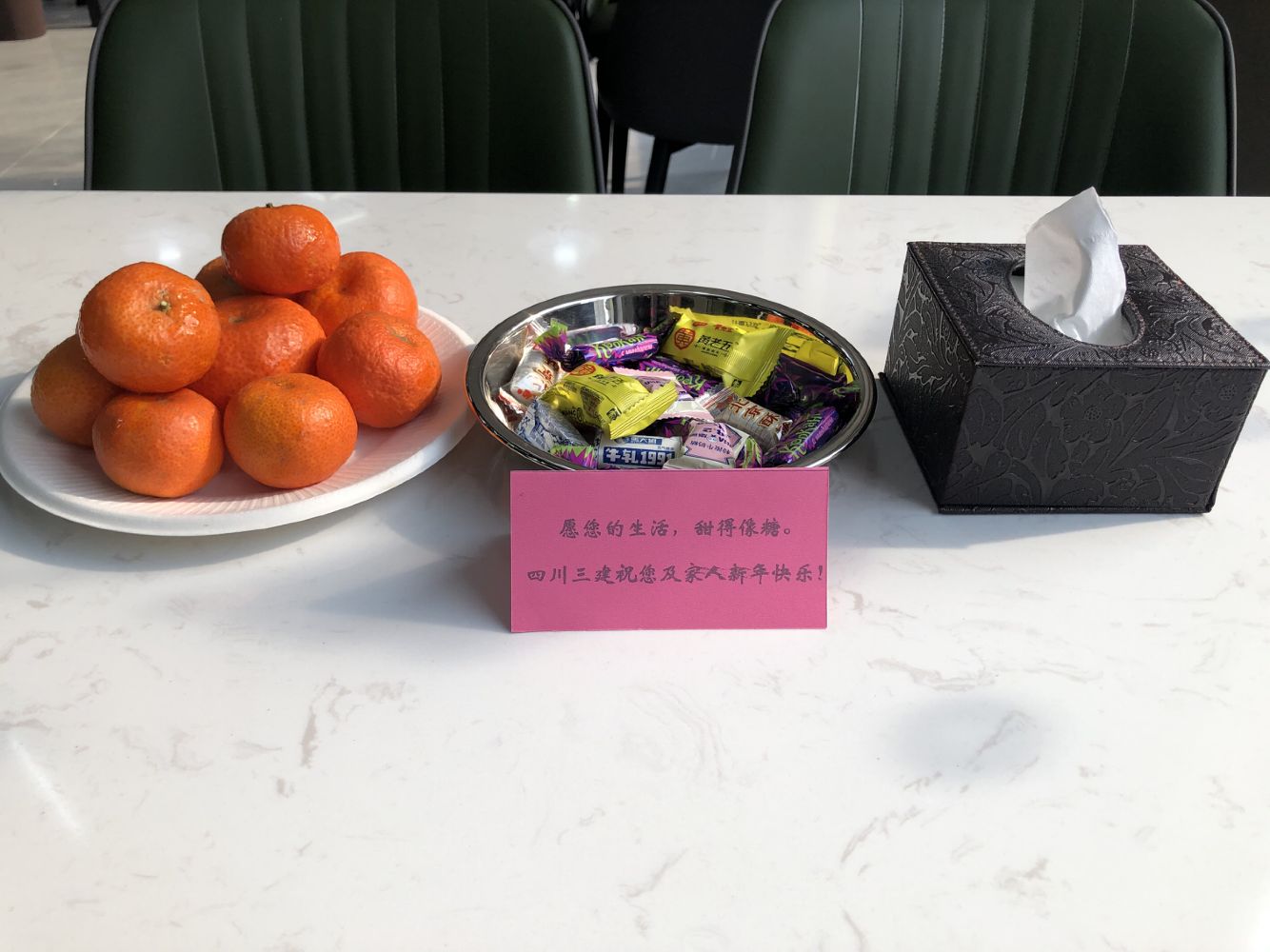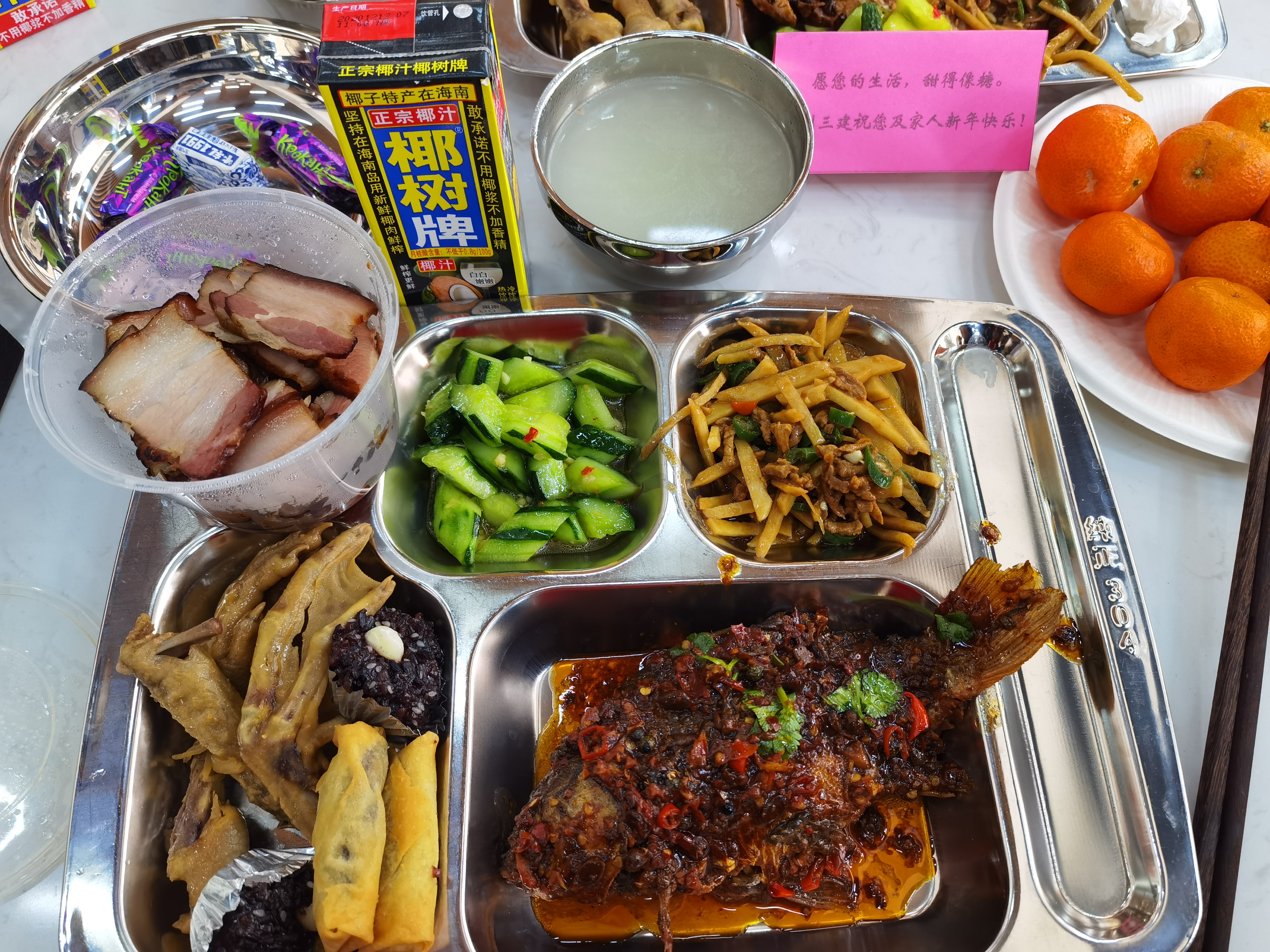 与平日的菜品相比,团年饭的菜品种类更为丰富,一道道菜品分别寓意着“年年有余”“招财进宝”等,橘子、糖果让年味儿更为浓郁,特别是每张餐桌上放置的粉色祝福卡更是引人注目:“愿您的生活,甜得像糖。四川三建祝您及家人新年快乐”,传递了公司对职工的美好祝愿。公司领导班子通过短片在大厅电视屏幕上向广大职工送上了新春祝福,激励全体职工在新的一年里革故鼎新,继往开来,砥砺前行,奋力推动公司高质量发展,为实现集团“千亿华西”和迈进“世界五百强”贡献力量。