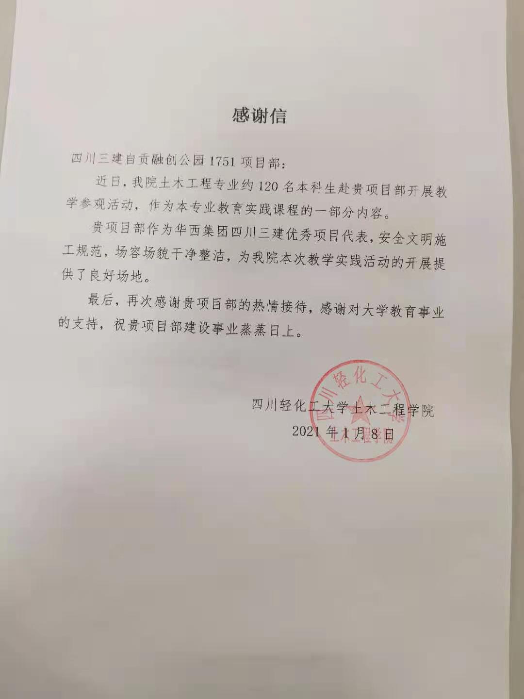 四川轻化工大学授课老师指出,自贡融创公园1751项目部作为华西集团四川三建优秀项目代表,安全文明施工规范,场容场貌干净整洁,为本次教学实践活动的开展提供了良好场地,并向项目部致感谢信,感谢对本次参加活动的土木工程学院师生的热情接待和对大学教育事业的支持。