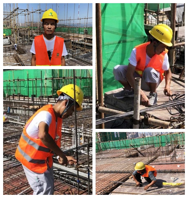 在烈日的炙烤下,板面上的钢筋已经被太阳晒得发烫,正在绑扎钢筋的刘亮,将扎丝穿插于钢筋交接处,打结、拧紧,汗水不停的从额头、两颊往下滴落,刘亮抬起手臂匆忙擦掉,又继续工作。