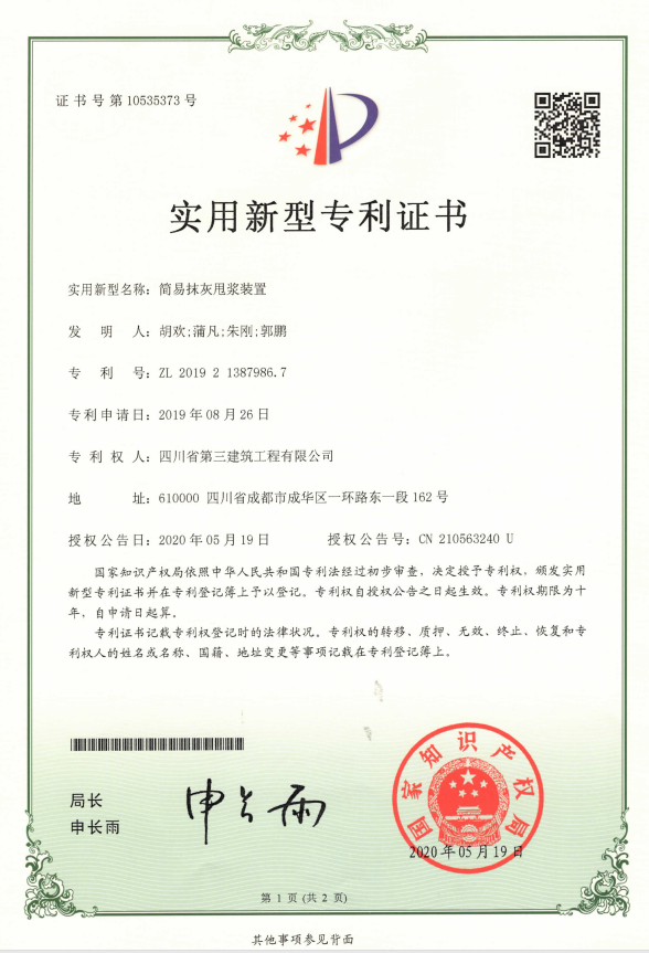 四分公司绵阳神州·南都三期项目申报“简易抹灰甩浆装置”专利于2020年5月通过了国家知识产权局初步审查并成功获得专利授权。