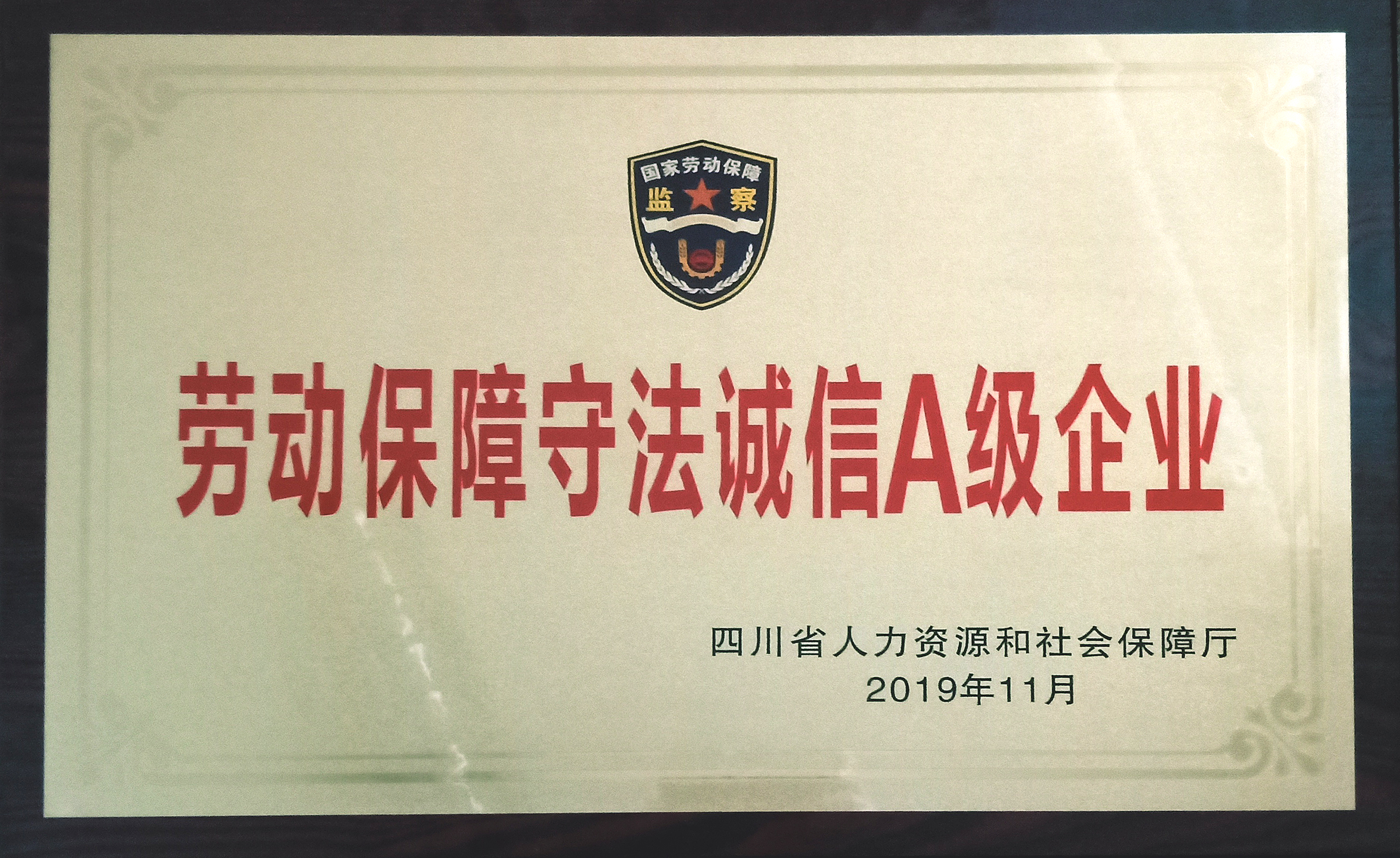 11月12日,四川省人力资源和社会保障厅对2018年表现突出的劳动保障守法诚信企业进行表彰,锦城公司荣获“2018年度劳动保障守法诚信A级企业”称号。