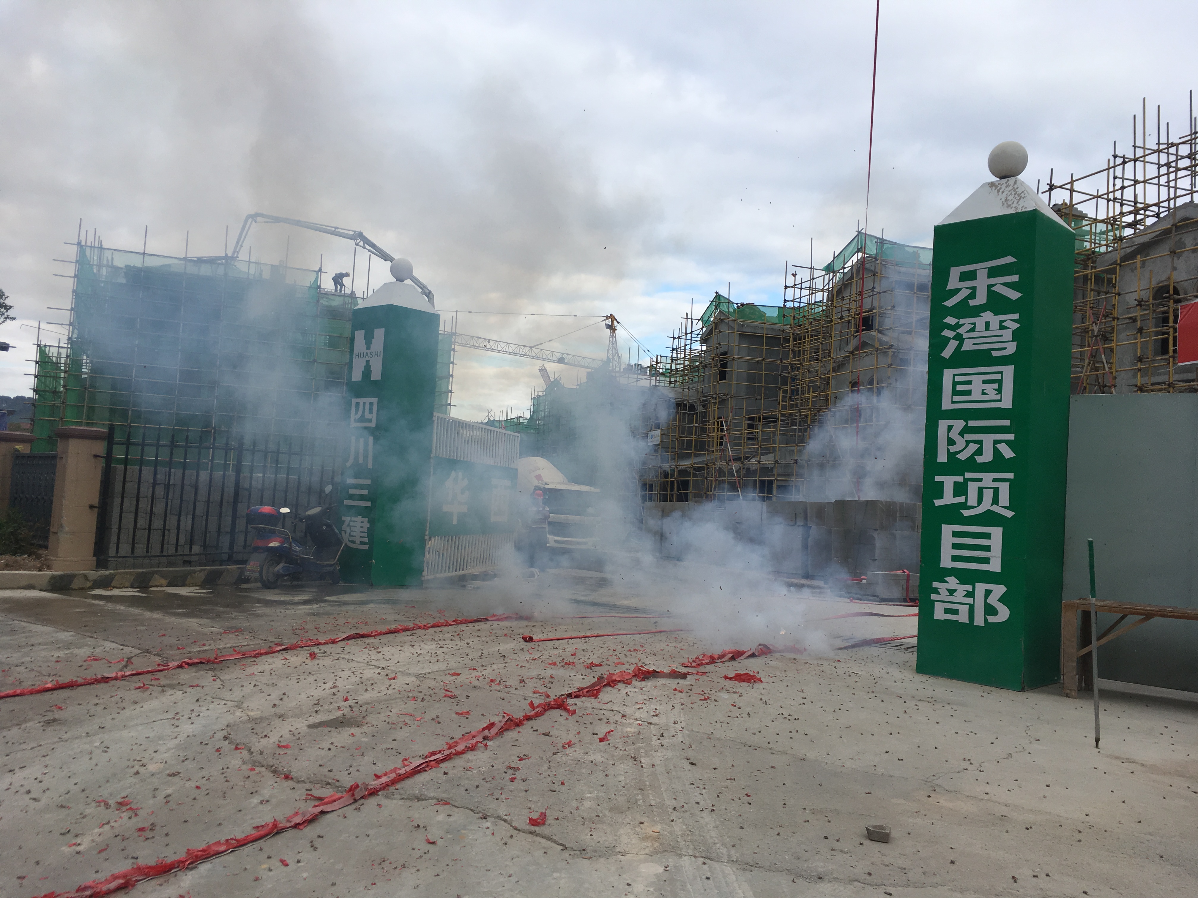 早上7:30,工地大门口,礼炮排列整整齐齐,76#别墅前架着一台车泵、一辆辆砼罐车、混凝土班组就位于76#楼坡屋面层,项目全体管理人员各就各位。所有人、材、机整装完备,为完成主体封顶的最后一次混凝土浇筑蓄势待发;早上8:08,礼炮哔哔啵啵开花,喜庆与吉祥漫天飞舞,最后一次混凝土浇筑转动起来;中午1:00,贵阳乐湾国际项目5-1地块主体顺利封顶。