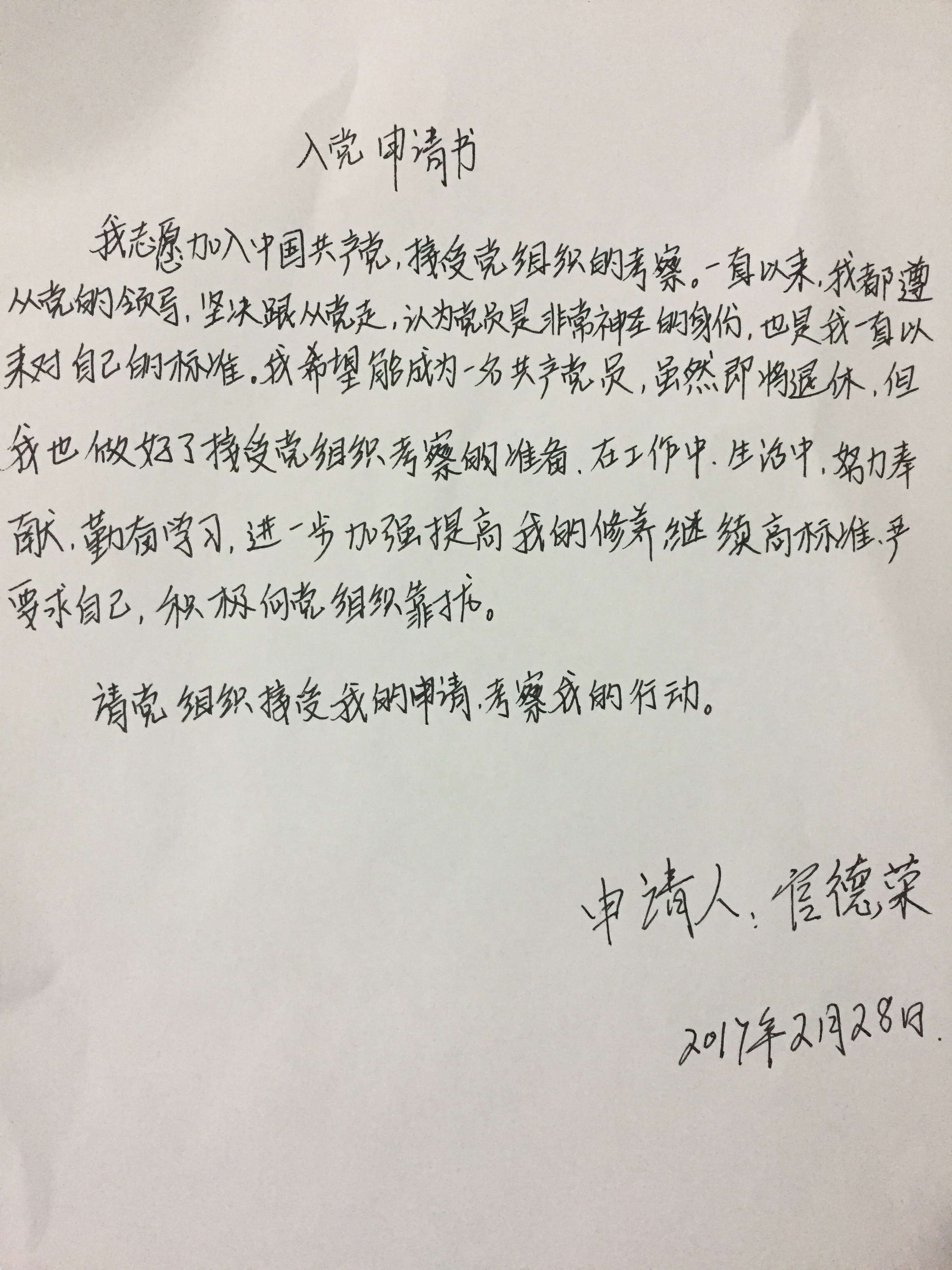 老官知道,提出入党申请不意味着立马可以成为正式党员,但可以接受党组织的考察,对于他来说也是神圣的,因为他为了这一刻已经做了37年的心理准备。我给老官说,你这可是很好的榜样啊,都应该像你学习,让我都觉得有点惭愧了。老官依然很平静,他说他做了37年的准备,却依然觉得离心头的那个标准有距离,快退休了,才终于鼓起勇气向组织提出申请。