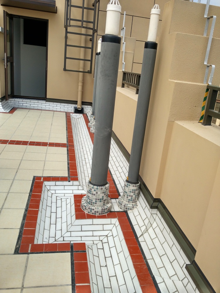 到达观摩现场后,分公司总工程师便带领大家对工程的整体外观、外墙、细部等方面进行观摩学习。我们首先观摩的是外立面的幕墙,由于是高层建筑,外墙装饰的竖向接缝尤为关键,所观摩工程做到整齐划一、墙面平整、阴阳角顺直、无色差裂纹,连窗台雨棚下的雨滴条都贯通得非常好,还刷了一层黑色的涂料,让线条更具美感,同时也显得非常的突出。紧接着,我们进入大楼,依次参观了屋面、标准层、地下室。进入楼层后的公共区域,一是发现整个内墙的瓷砖接缝经过打胶密实,整条缝没有弯曲、倾斜,胶缝宽度均匀,表面经过人工勾缝,整体观感效果极佳,大家都对该工程内墙施工的细节要求和高标准表示认可。二是楼梯间楼梯踏步的处理上踏步尺寸、踢脚线高度一致,踏步上的防滑条极其美观,在梯板的下方还设置了贯通的滴水线。最大的亮点是在楼梯踏步或者窗台的阳角处都设置有铜条,不仅起到了保护的作用,更增加了其美感和档次,给你眼前一亮的感觉。我们把观摩重点放在了屋面,屋面是最需要我们学习的地方,可以看到屋面分仓缝的设置,通风孔的防水处理,排水沟的细部做法等等。屋面分仓缝采用沥青防水压条与密封胶结合施工,与周围的防滑地砖相互映衬,面砖的排版合理,天沟泛水宽度一致,泛水坡度流向明确,给人整洁有序的感觉。在保温层通气口的处理上,采取在PVC通风管外套上钢管然后刷上与建筑屋面色调协调的油漆,穿屋面管道套高度符合规范要求,套管外侧用瓷砖装饰,这样即保证了屋面保温层的透气性,又增加了屋面的可观性。屋面的排水沟排水顺畅,落水口采用不锈钢板制作,放水收口简洁美观,屋面各个地方的细节处理都是非常到位的。