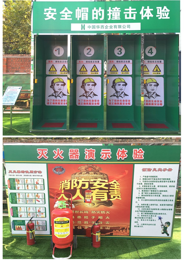 该安全体验馆面积约200㎡,设有平衡木、安全帽撞击、洞口坠落、消防情景模拟、安全带使用等8个体验项目,基本涵盖了建筑施工现场的各种安全问题。体验馆以图片展示、案例警示、实景模拟、亲身体验等直观方式,将施工现场常见的危险源、危险行为与事故类型具体化、实物化。现场管理人员和农民工兄弟可通过模拟环境中的具体活动亲身体验施工现场危险行为的发生过程和后果,反思与安全工作有关的态度、行为,提高安全生产意识和防范水平。