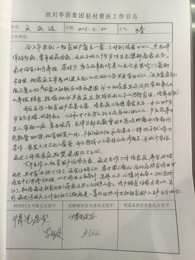 在双腾镇两河村,公司选派的驻村干部王亚运积极与双腾镇党委加强联系,在村委干部的带领下,很快便进入角色,通过采取走访、查看资料、召开座谈会等形式,迅速掌握了两河村基本情况并积极开展工作。他坚持每天写工作日记,及时记录下自身的思想、学习、工作和生活情况,以一颗强烈的责任心和上进心诠释着一名三建人的担当。现摘取部分工作日记如下: