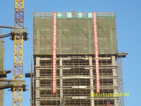 在金色的深秋内蒙古分公司收获了第一枚成果,2011年11月1日鄂尔多斯广场三标段项目G1#\G2#楼主体顺利封顶,该工程由鄂尔多斯地产开发有限责任公司投资建设,于2011年4月12正式开工,总建筑面积58万㎡,我公司承建了11万㎡(其中单体G1#、G2#、 G8#)包含了1.4万平米的地下车库及设备用房、地上五层商业铺面及高级写字楼、高档SOHO公寓。