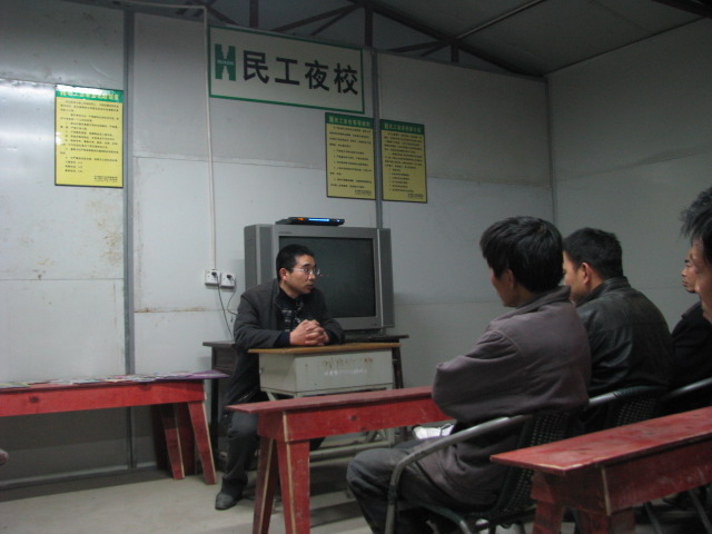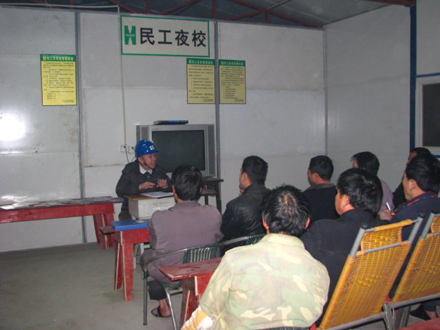 2010年1月13日7时30分,六分公司建院项目工地上,民工陆续来到工地民工夜校的教室里,民工夜校准时开课。一间板房教室,满满当当地坐着17名工人。虽然条件稍显简陋,但教室里电视、录像机、图书、宣传栏等设施一应俱全。这堂课的主讲项目质量安全主管郭荣清向工人们讲解了施工中的施工技术及安全注意事项,让农民工了解各种安全制度,其中包括施工过程中的劳动保护,安全生产、用电、防火知识等。随后,项目部执行经理朱建就项目节前质量、安全、农民工工资等重要问题做出了通报。学习期间,农民工都能认真听讲、做好笔记,达到了预期效果。当晚两堂课共培训农民工35人。