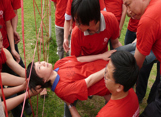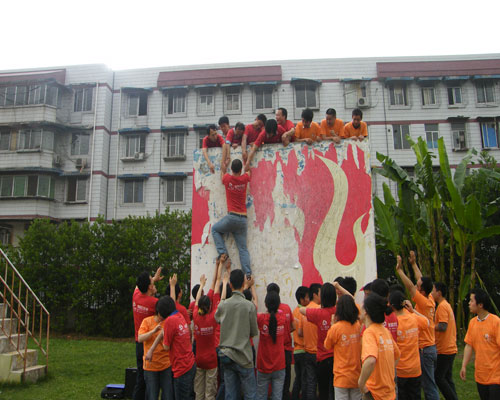 9:30,为期一天的拓展训练在教练的统一安排下正式开始了。当队员们在教练的带领下,经过大家的不懈努力,完成了热身小游戏、企业机车、高空断桥、合力电网、火海逃生五个彰显团队力量的训练项目后,队员们都深深感悟到团队的力量是不可战胜的。如在高空断桥训练单元里,一个队员因心理障碍,无法完成高空断桥的跨越时,下面所有的队友不停地呐喊助威,一直为他加油鼓劲,因为他们知道,他是他们中的一员,他们是一个团队,不能让任何一个队友掉队。上面的队友也因得到大家的支持而勇敢地跨越断桥后,下面是一片掌声和欢呼,那时候团队荣誉感因此更为强烈,那种团队精神让人感动和振奋。当火海逃生中最后一名队友成功翻越逃生墙后,四十多名队员一起欢呼跳跃“成功了,我们成功了!”原以为根本无法完成的任务,在队员们相互支持帮助下仅仅九分多钟就完成了,这就是团队的力量,这怎能不让人感到兴奋。