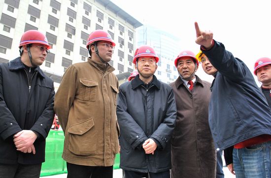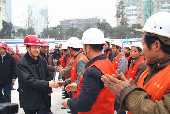 2009年元月20日下午,省人大常委会副主任、党组书记甘道明等领导一行在四川华西集团总经理陈贵林,三公司党委书记、董事长张双华的陪同下,来到三公司四分公司承建的锦江大礼堂舞台及一号办公楼项目施工现场,亲切看望、慰问了项目全体参战人员。甘副主任来到项目职工中间,亲切询问了他们的工作和生活情况,并为他们送上了新春的祝福!甘副主任表示:“同志们为项目的建设付出了辛勤的劳动,我代表省人大来看望、慰问你们,祝福大家新年快乐、身体健康、合家幸福!”