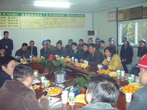 验收过程中,由市建委、市安监站、龙泉驿区安监站组成的检查小组在公司王亚风副总、分公司经理王红莲以及项目相关人员的陪同下, 察看了施工现场的场容场貌,并重点检查了垂直运输机械、外架、临边洞口防护、临电工程及安全资料等。