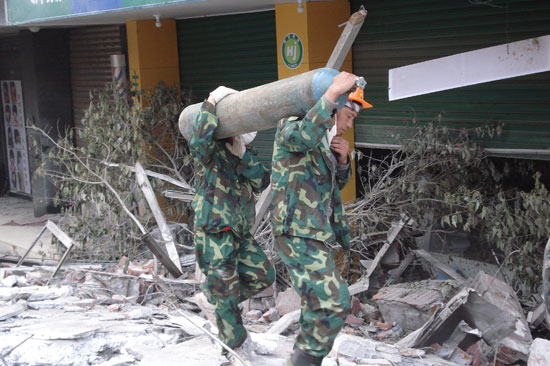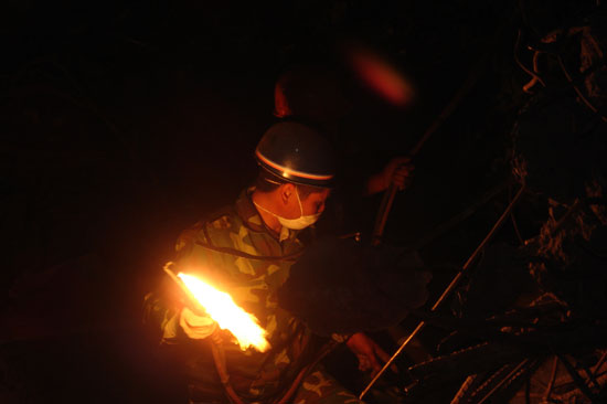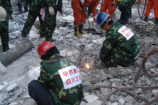 由于抢险工作量实在太大,所有参战人员在13日晚几乎是彻夜未眠,抢险队长郭俊清,患糖尿病刚出院,个别同志也身患感冒腹泻等疾患,尤其是抢险现场一位连续三天三夜没合眼的操作大型破碎机的姓童的当地自愿者,更是鼓舞和激励着全体抢险人员,由于全天不停地下着雨,所有参战人员全身都不断地往下淌水,且余震在整个抢险过程中持续不断,但是面对灾情和急需救援的生命,大家毫无怨言,心里都有一个共同的目标,及时将被埋人员施救出来。从抢险现场实际出发,由指挥组的同志在下面协调救援机械,不断修正抢险措施,副领队蒋刚同志则带领抢险人员和消防官兵一起冒雨清理残渣。风雨声、机械轰鸣声、机具敲击声汇成了一支动人心魄的抢险乐章。经过百余人和近10台大型机械的相互配合,13日当天,抢救所必须的搬移建渣的记录不断被刷新,这也让所有家属和群众看到更多人生还的曙光,我们也再次企盼能创造新的奇迹。事实也证如大家所盼望,到15日零晨,最后一名幸存者被成功地被消防官兵从废墟中抢救出来。截止16日,我们已经连续战斗近100个小时。100个小时里,大家的生活虽有基本保障,但是大家都没能睡上一个好觉,没有换上一身干衣服,雨水、汗水将衣服湿透了又穿干,特别感人的是承担钢筋切割任务的农民工刘兆军同志,双手被滚烫的焊花烫出了一个又一个的水泡,裤子也被烧了许多洞,即便是如此,面对巨大的灾情,也为了更多的生命得到救援,大家都克服了所有困难,决不放弃我们的抢救任务。在接下来的72个小时里,全体参战人员以高度的责任感和使命感继续投入到繁重、紧张、井然有序的抢险工作中,累得不行了就一屁股坐在残砾上喘口气,喝口水,抽口烟,困得不行了就在路边空地上靠一会儿,或者车上打个盹。
