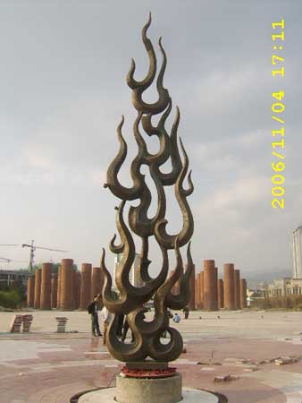 大剧场内两座地下室:地下最低11.35米,舞台上空建筑最高36.5米。剧场分设升降舞台,两个舞台侧厅,升降乐池,观众厅,2层包厢,以及配套用房。可容纳1000名观众。 三大广场呈一致对称分布,每个广场约10000m2。柱阵广场呈现扇形,由虎阵和56根民族柱。虎阵高9m,长30m,宽9m。群虎大体是由花岗石雕刻而成。56根民族柱,每根代表我国一个民族。柱高9m,直径2000,艺术柱主体由直径1200钢筋混凝土构成,外装饰由红砂岩砖砌,且每根柱表面均有代表一个民族的浮雕。地面均由花岗石和五彩石铺成。(上接一版)中心广场是半径60m构成圆形。整个广场由火把山,柱阵广场,树阵广场,艺术中心包围。广场地面由红色、白色花岗石按天文星图铺成。中心点设置9m高铜火炬。火炬下设直径24m的倒影池。