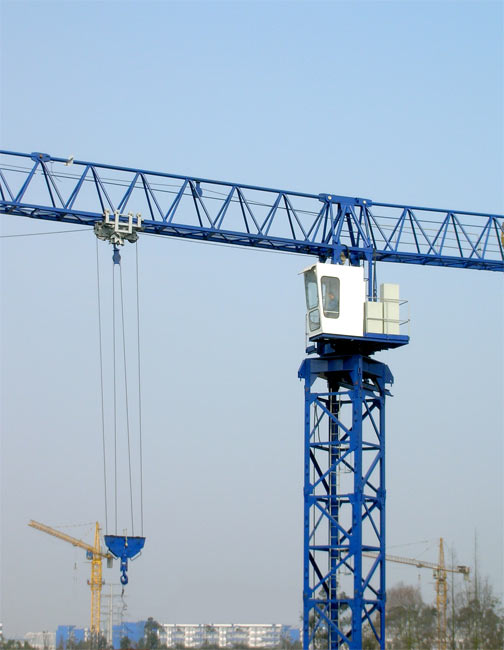 平头塔机最显著的结构特征是没有塔帽和拉杆,这一特殊的结构形式使平头塔机与尖头塔机有了质的区别。与普通尖头塔机相比,平头塔机具有安拆塔机时对所需起重设备能力要求不高的优点;适用于群塔交叉作业;适合对高度有特殊要求、对幅度变化有一定要求的场合施工;更方便条件受局限的施工现场上的塔机安拆;其吊臂钢结构寿命长、安全性高;吊臂的适用性好、利用率高;设计成本低等优点。其使用寿命可大幅延长。在机场、高速铁路、桥梁、施工场地狭窄等施工条件下有很好的使用价值。