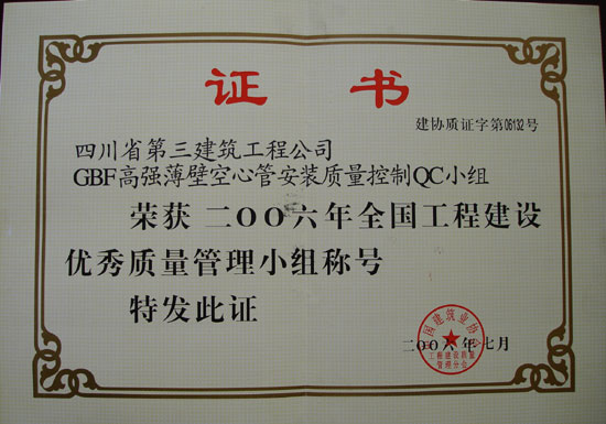 省建三公司钱江铂金时代工程位于成都市骡马商圈,该工程地下3层,地上20层,总建筑面积105476㎡。工程结构形式为框架剪力墙结构,要求室内净空比较高,设计荷载比较大,因此,地下室负三、负二层板设计成GBF高强薄壁空心楼板,以增加室内净空和承载能力。针对GBF高强薄壁空心楼板施工作为一种新工艺,施工人员对相关的操作规程不太熟悉以及工程工期紧、质量要求高等特点,项目部为了高质量地完成施工任务,于2005年6月成立了由该工程项目经理刘华松同志担任组长的“钱江铂江时代GBF高强薄壁空心管安装质量控制QC小组”。施工中,QC小组严格按照活动的要求,认真分析现场、开展调查研究,分步骤、分阶段地开展了QC小组活动,在历经40天的小组活动后,GBF管的安装质量有了大幅度地提高,有效地保证了工程的工期和质量。QC小组活动结束后,小组成员进行了活动总结,写成了《确保GBF管安装一次成优》施工作业指导书,在今后类似的施工中将会起到很好的指导作用。项目部通过开展QC小组活动,保证了工程质量和进度,得到了监理单位和建设方的高度评价,为公司赢得了良好的社会信誉。同时,小组成员的质量意识得到较大提高,进一步增强了员工的团队意识,有效地促进了项目的管理水平,达到了项目管理和人才培养双赢的良好局面。