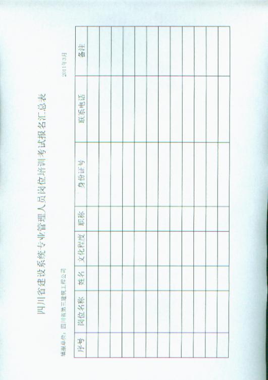 每期每人只能报考一个岗位,免培人员为从事本岗位工作一年以上,且具有本专业或相近专业大专(含)以上学历,或相关专业中级(含)职称以上。免培人员报名必须提交学历证书或职称证书原件、复印件,附身份证复印件一份和一寸免冠彩照2张,并填写《四川省建设系统岗位培训考试报名表》,培训考试人员交身份证复印件一份和一寸免冠彩照2张,培训考试和免培考试两种人员分别填写《四川省建设系统专业管理人员岗位培训考试报名表》汇总后于3月2日前交公司人力资源部。