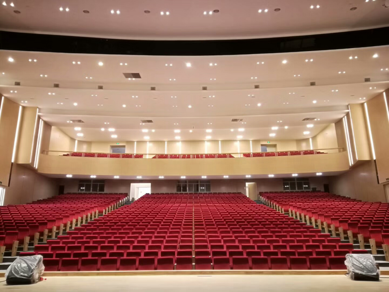 礼堂观众厅单体面积约1450㎡,层高达到14.3米,吊顶部分装饰造型复杂,跨度大,高空作业面广。为保质保量完成施工任务,项目团队在充分熟悉图纸的基础上,对施工现场进行了仔细勘测,并在图纸会审中指出可能遇到的问题及具体的解决方案,做到未雨绸缪,避免后期施工因技术及图纸问题影响工期进度。为确保高空吊顶作业人员的安全,项目部采用了6副移动脚手架,并用架管旋转扣件进行固定,礼堂中间搭设满堂脚手架,并在满堂架上铺上模板及施工跳板,有效地避免了安全事故的发生。由于礼堂吊顶的造型较多,对灯具的安装定位难度大,每个位置的灯具必须按照吊顶的弧度来进行定位。在14.3米的高空点亮的不仅是一排排弧线筒灯,更闪耀着华西人“建时代精品 筑美好人生”的企业宗旨。