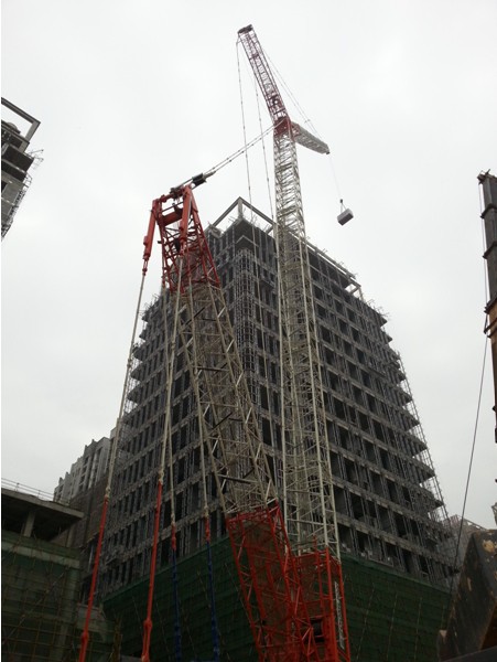 其中3#楼为17层LOFT,建筑高度为103.75米,于2013年12月30日封顶。在3#楼屋面有4台用于空调供暖的真空热水锅炉,两台6.6吨,两台12.5吨。由于3#楼安装的塔吊为QTZ5013型号,不足以起吊两台12.5吨的锅炉。经项目部三方协商,决定采用中联重科QUY500W履带式起重机起吊这两台12.5吨的锅炉。中联重科QUY500W履带式起重机具有强大的起重能力:主臂最大起重量450t,超起工况最大起重力矩5400t?m。灵活的工况配置组合:自由组合的工况可达8种;超起主臂工况下臂架可达126m、塔式工况臂架组合可达84m+84m、固定短副臂工况下臂架组合可达84m+12m。稳重的底盘设计:轨距为8m的底盘,保证360°回转范围内出色的整机和作业稳定性。