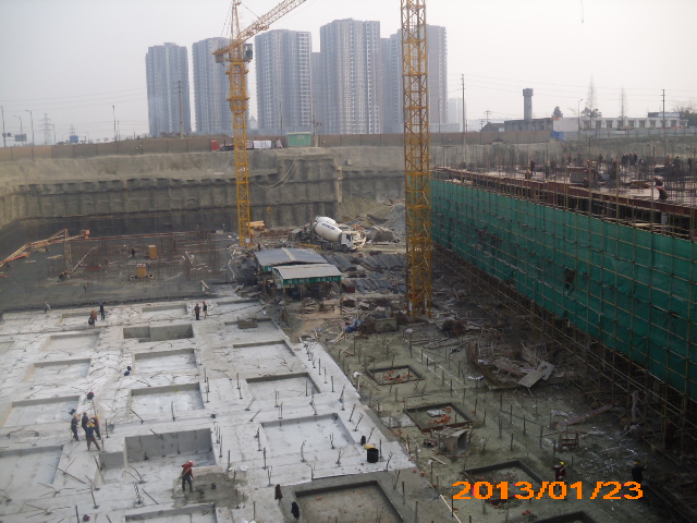 工程项目位于郫县犀浦镇梓潼村,分为1、2、3、4号楼,地下3层,地上26层商住楼,总建筑面积为85600㎡,框剪结构。继2012年12月30日上午4号楼筏板基础砼顺利浇筑完成后,在分公司、公司各职能部门的帮助、关心、支持下,工程施工进展顺利,项目全体参战人员克服施工场地狭窄、工期紧的重重困难,抢工期、抓质量、保安全,心往一处想,劲往一处使,加班加点,管理人员吃住在现场。