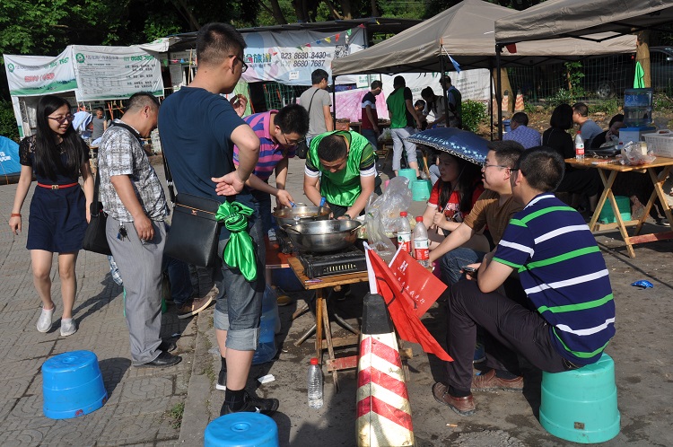 队伍下山后,直奔莲花湖,并搭灶、搭帐篷于湖畔。每个队自取食材、自作晚餐,有分工、有合作,忙得不亦乐乎,一会儿便炊烟四起。经过近两个小时的努力,大家终于能够享受当天的晚餐,并与其他小组相互分享食物。虽谈不上美味佳肴,但“劳动最光荣”,只要是自己亲手所做,吃起来都津津有味,回味无穷。青年们完全卸下了工作中的紧张和压力,尽情享受着大自然的馈赠,拓展恬静幸福的心境。