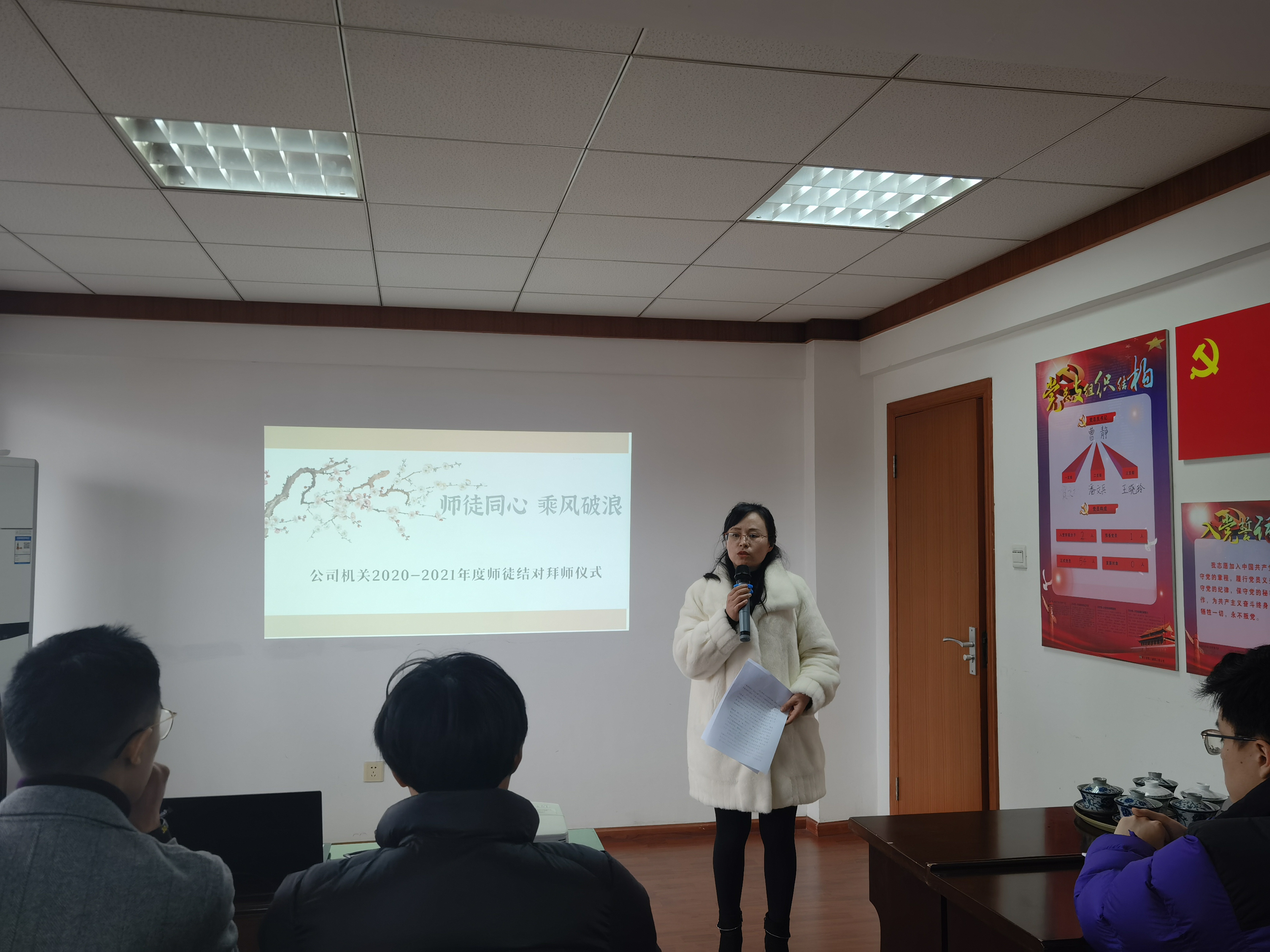 2月3日下午,公司机关举办了“师徒同心,乘风破浪”2020-2021年度导师带徒拜师仪式,初入职场的萌新们手持拜师帖,以茶敬师,与“老师”立下师徒之约。公司总经理助理、机关党总支书记、人力资源部部长曹静作为见证师出席仪式,拜师仪式由公司机关团支部书记主持。