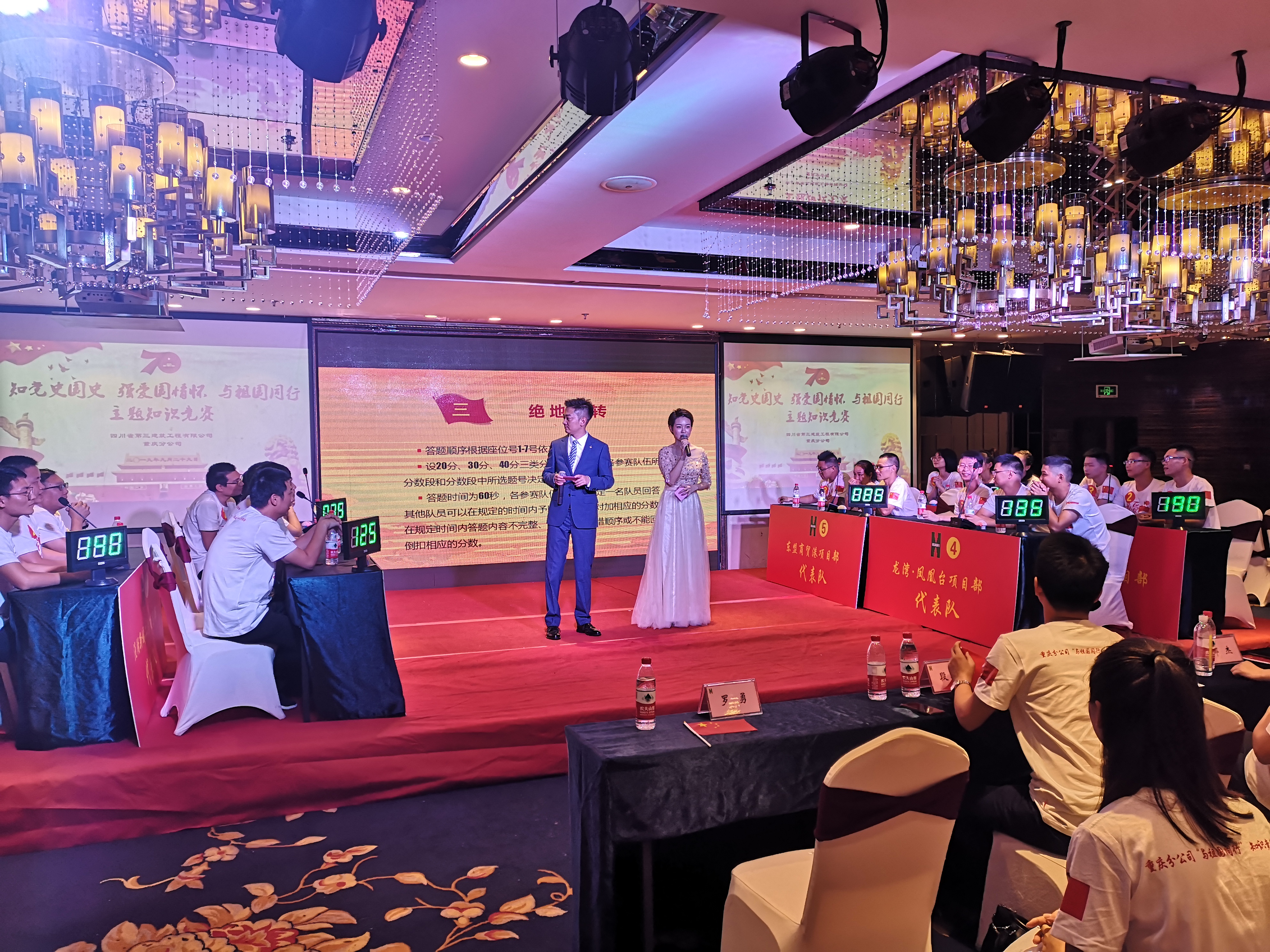 为热烈庆祝中华人民共和国成立70周年,9月29日下午,重庆分公司开展了以“知党史国史、强爱国情怀、与祖国同行”为主题的知识竞赛活动,由分公司各科室、各项目部的21名选手组成的7支参赛队伍,用他们的激情和方式为伟大祖国母亲献上了生日祝福。公司党委副书记、副总经理、工会主席梁涛,公司党委工作部负责同志一行出席活动,分公司班子成员及各科室、各项目职工等共计50余人参加活动。