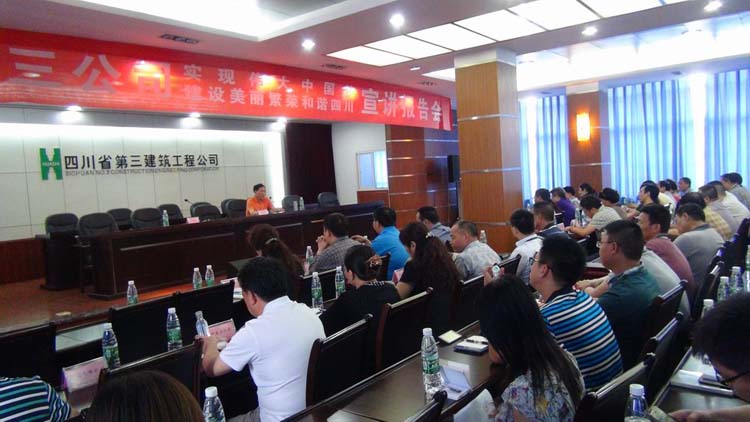 为进一步加深广大干部、党员和职工群众对深入开展“实现伟大中国梦、建设美丽繁荣和谐四川”主题教育活动的认识和理解,进一步增强贯彻落实集团党委的决策部署和公司党委要求的自觉性和主动性,把思想行动统一到打造中国一流建设集成商的宏伟愿景和公司“百亿三建”的光荣梦想上来,推动公司持续快速健康发展,6月5日,公司举办了“实现伟大中国梦、建设美丽繁荣和谐四川”主题教育活动宣讲报告会。公司领导,总经理助理、三总师副职,分公司党政工团负责人、公司机关全体职工以及部分基层职工代表共计180人聆听了此次报告会。报告会由主题教育活动办公室主任、公司党委委员、工会主席、纪委书记郭俊清主持,主题教育活动领导小组组长、公司党委书记黎伯均作宣讲报告。
