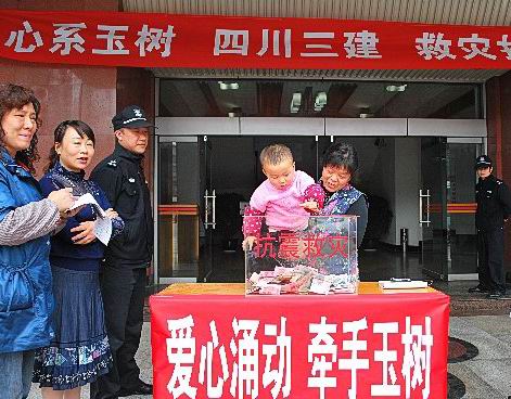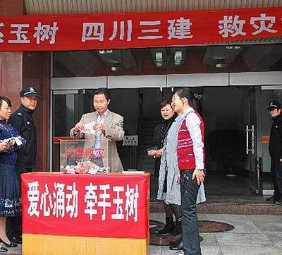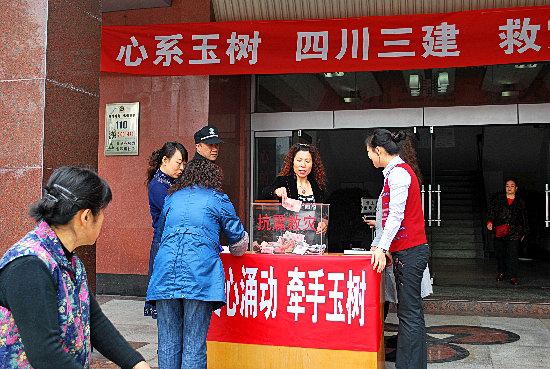 4月19日上午,三公司党委向各级党组织和广大党员、职工发出号召:希望大家积极发扬“一方有难八方支援”的抗震救灾精神,以感恩的心回报玉树,用我们的爱心为灾区同胞筑起一个新的家园。两天来,公司各级党组织和广大党员、职工积极行动起来,开展为灾区献爱心捐款活动。公司领导带头捐、党员和职工踊跃捐,大家都表示,要用行动和爱心为灾区建设尽绵薄之力。在公司机关开展献爱心捐款活动中,一位不愿透露姓名的市民和一位在“5.12”降生的孩童在家人的陪同下自愿加入了献爱心行列,当问及他们自愿捐款的原由时,他们用最朴素的语言诠释了一种爱的力量,那就是“报恩”!截止4月21日,公司共收到职工捐款77395元。