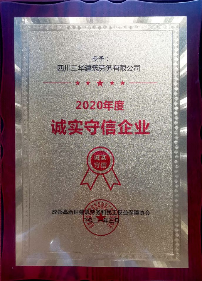 近日,成都高新区建筑劳务和民工权益保障协会召开2020年度诚实守信企业、诚信班组长表彰大会和建设工程质量安全管理工作会议,三华劳务公司在此次表彰中荣获“诚实守信企业”荣誉称号,这也是三华劳务公司第四年获得该项荣誉。