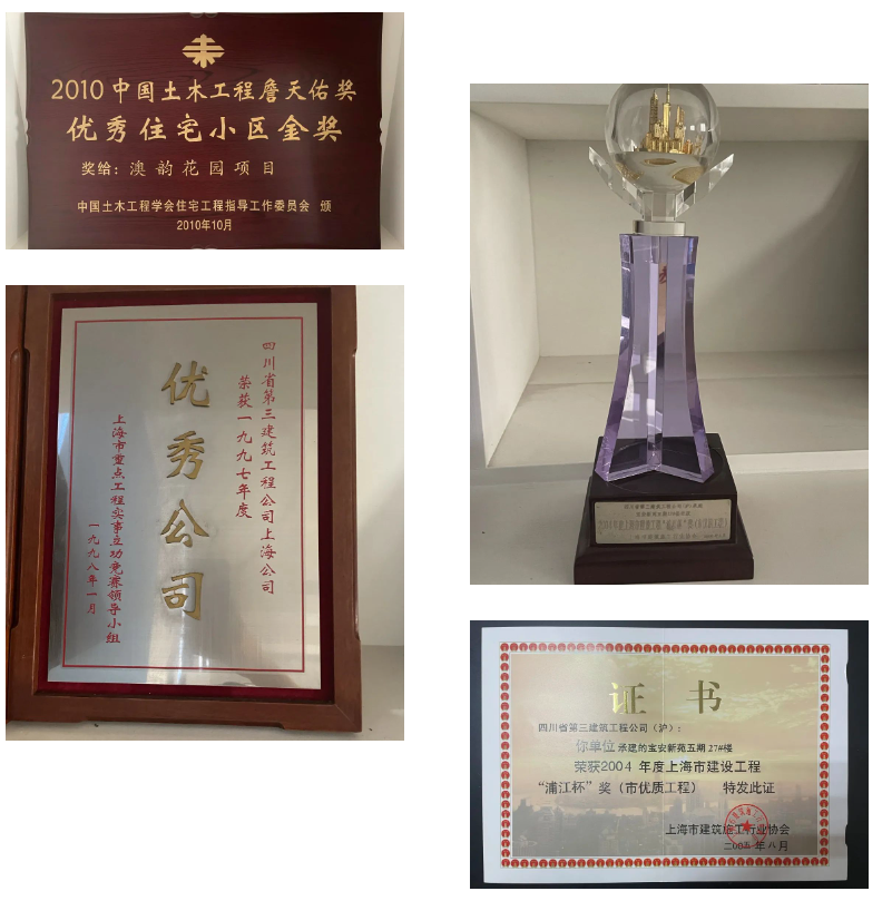 “社会治安综合考评先进集体” “住宅立功先进公司” “上海市安全生产先进单位” “创优达标先进单位” “詹天佑奖” “浦江杯”......琳琅满目的荣誉墙成为了对公司拓荒先锋们无声的赞誉。
