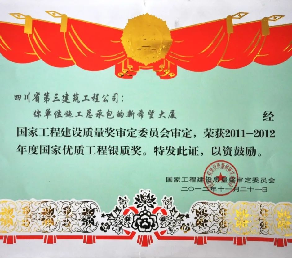 2012年,实施精细化管理,新希望大厦工程荣获“国家优质工程银奖”。
