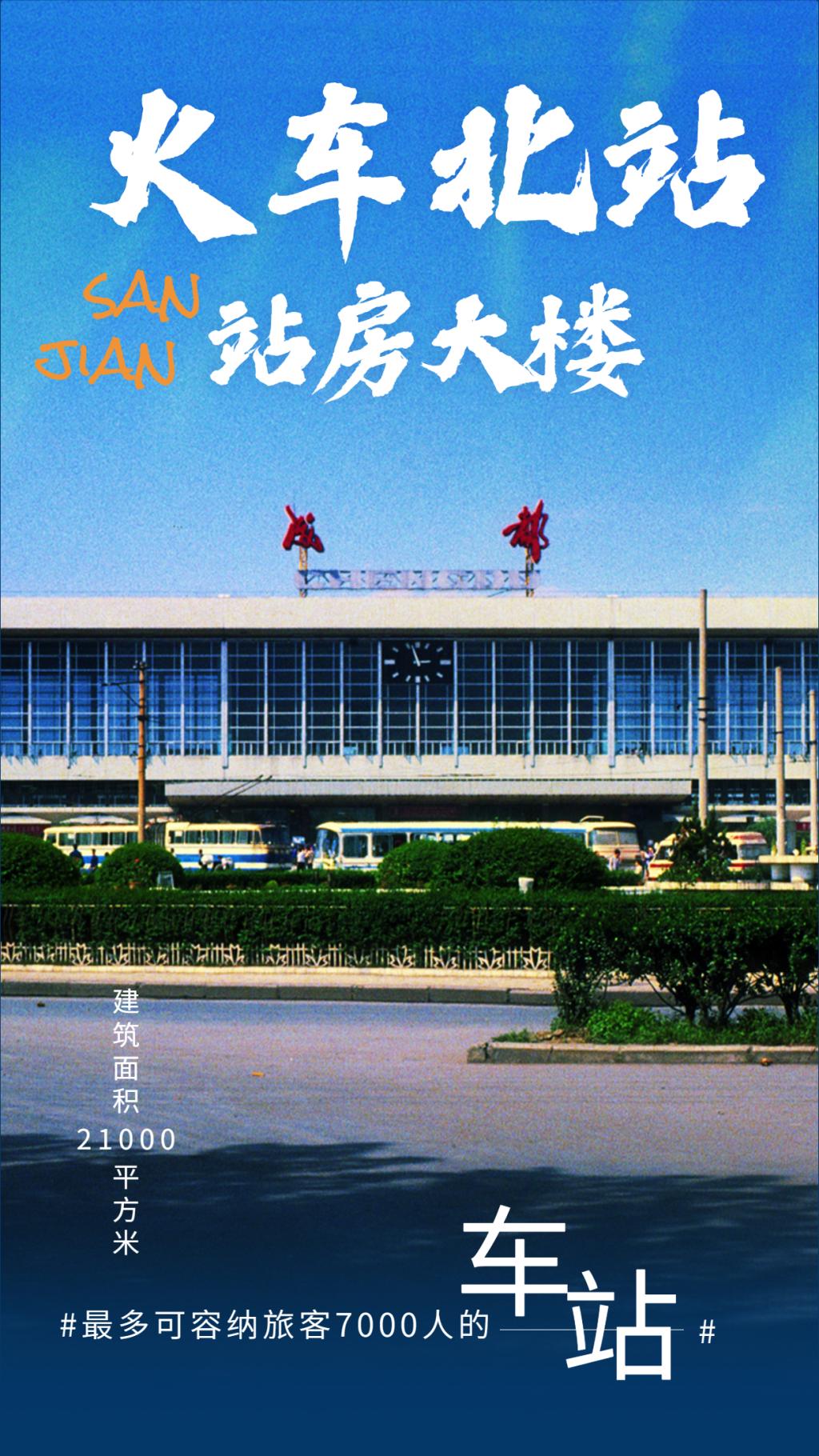 火车北站站房大楼的候车大厅为两层建筑,分设中间大厅及东、西两侧厅。中间大厅长、宽各36米;东、西两侧厅各宽36米,长64米,再加上四周的出檐,大厅屋盖的总宽度为46.8米,总长度为176.4米。候车大厅要求内部不设柱子。火车站站房土建、安装1984年上半年完工,7月1日交付使用,站前小伞壳分批施工交付使用,成为火车北站的重要标志性大楼建筑,一直沿用到2022年。