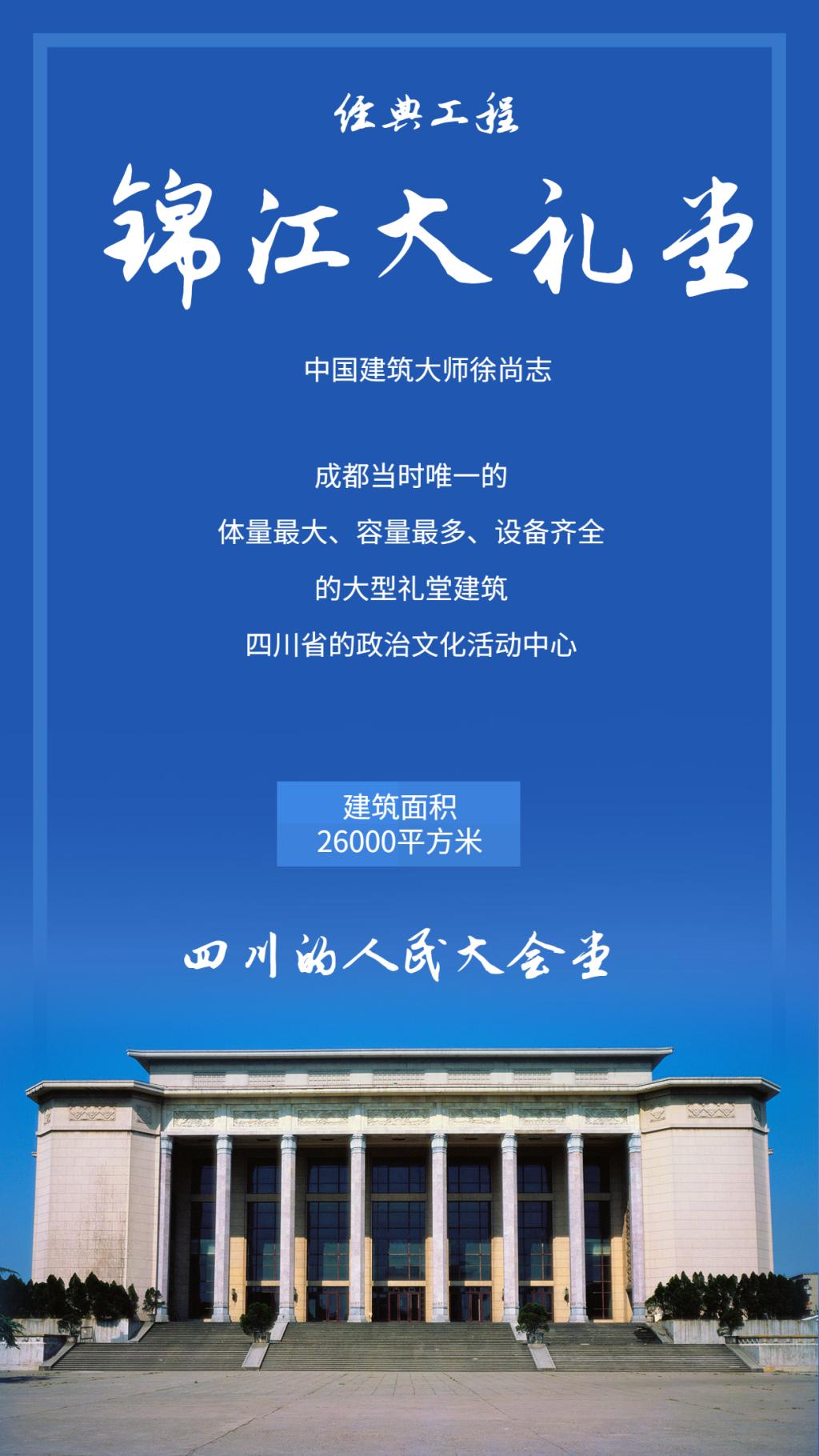 锦江大礼堂位于成都人民南路西侧,南与锦江宾馆(也是公司修建)为邻,礼堂与宾馆相互配合使用,形成了成都具有代表性及标志性的建筑群体,为成都当时唯一的体量最大、容量最多、设备齐全的大型礼堂建筑,是四川省的政治文化活动中心,被称为四川的“人民大会堂”。