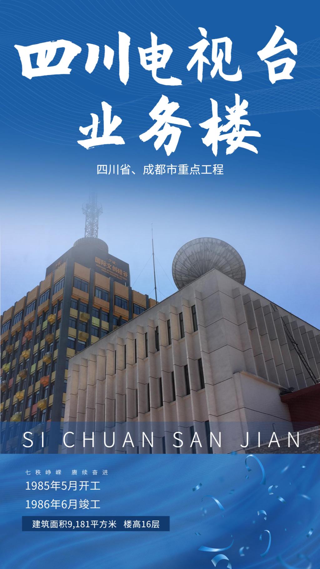 四川省电视台位于成都市少城街道东胜街与斌升街之间,地下一层,地上14层(局部16层),结构高67米,发射塔顶标高97.7米,建筑面积9163平方米,由成都市建筑设计院设计,7度地震设防,地下室按5级人防箱型基础设计。该项目一直列入省、市重点及有影响的工程,于1985年3月开工,1986年9月竣工。